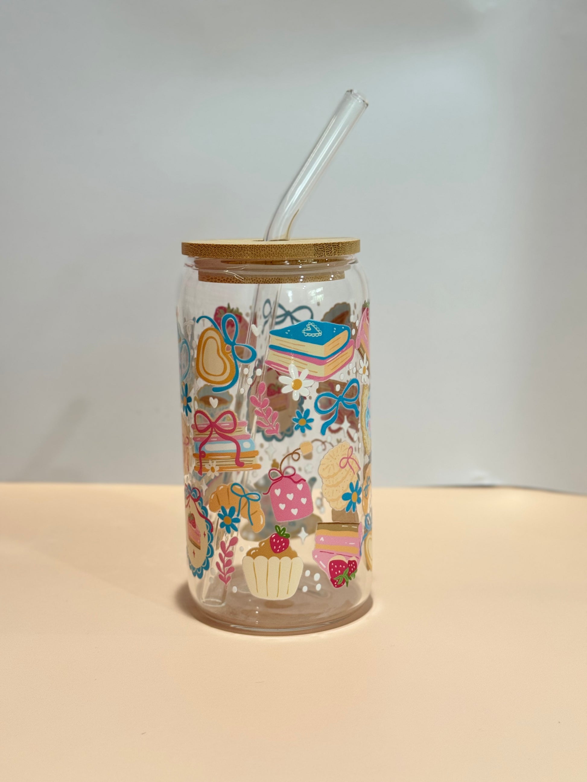 Elevate your tea time with these charming Blue Coquette cup wraps print in a 16.9 oz clear can glass.